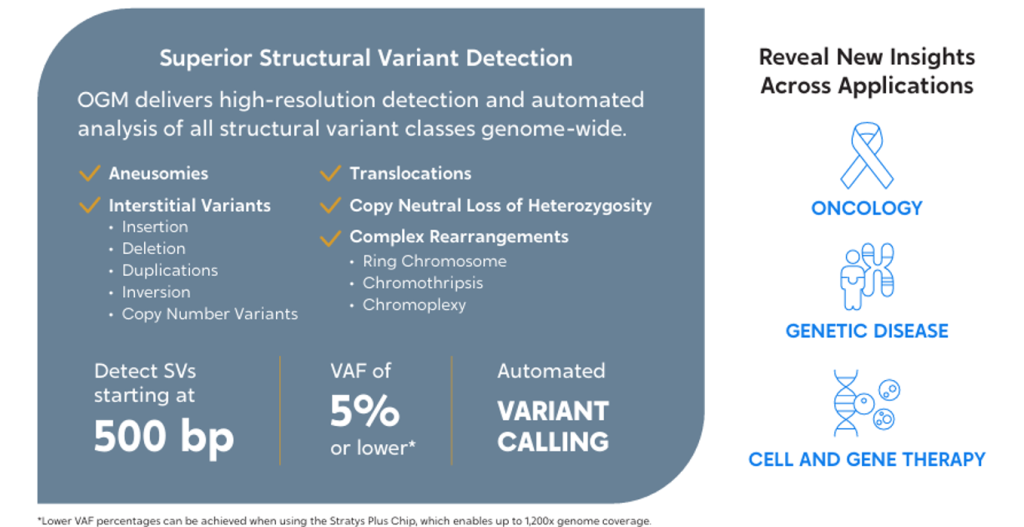 Reveal all classes of structural variants and leave the limits of traditional cytogenetics and sequencing behind with OGM and the Stratys System.